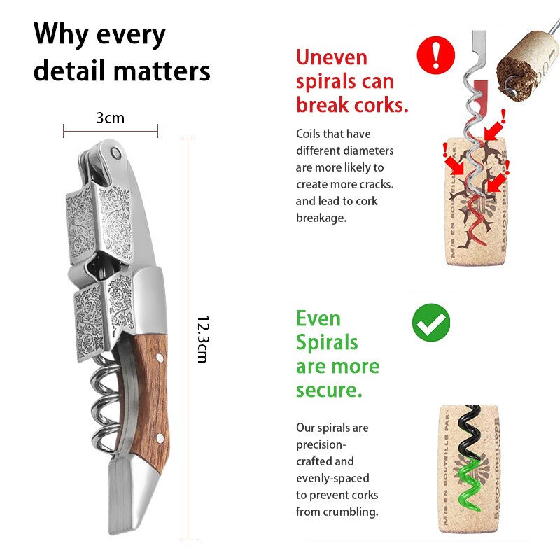 đăSolve Broken Corks and Broken Waiters Corkscrewsă Curated the sommelier in mind, made of premium stainless-steel with elegant wooden grip, makes it ideal for any hectic work environment that requires extensive use of the wine bottle opener and it can handle any kind of cork or metal cap effortlessly. the construction also makes the corkscrew sturdy, durable and offers excellent balance.