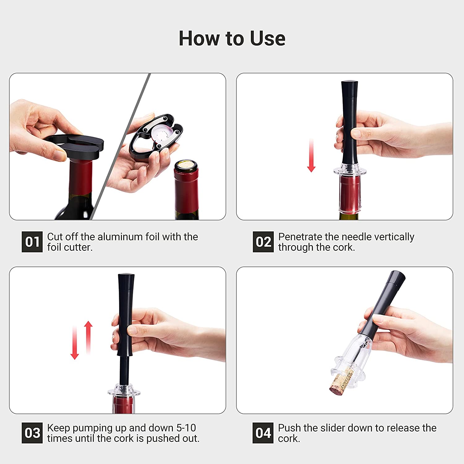👉【4-in-1 Gift Set】 The wine opener set includes an air pressure pump bottle opener, a foil cutter, a wine aerator pourer and a vacuum stopper. One stop solution for wine opening, pouring and preserving.